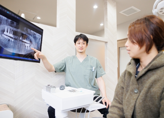患者さまの中には、骨の厚みが足りず、インプラント治療を諦めている方がいらっしゃるかもしれません。当院では、そうした難症例の場合でも、骨の再生治療を行うなどできる限りの対応をさせていただきます。また、診査・診断をしっかりと行い、患者さまの理解・納得を得たうえで治療に進みます。まずは一度ご相談ください。